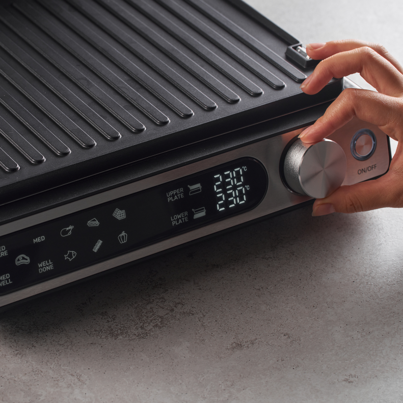 Мощность у Optigrill на высоте — 2000 Вт, этого хватит для любого, даже самого толстого куска стейка. На сосиски, котлеты и другие, менее серьезные блюда его хватит с запасом. Но при испытаниях мы столкнулись со странным поведением нагревательных пластин. Мало того, что они долго прогреваются, к тому же это происходит неравномерно — верхняя панель греется ощутимо дольше и пиковая температура у нее ниже. На вкусе стейков это не сказывается, но заметно, что снизу они получаются более глубоко прожаренными, так что профессиональным стейкоделам это может не понравиться.