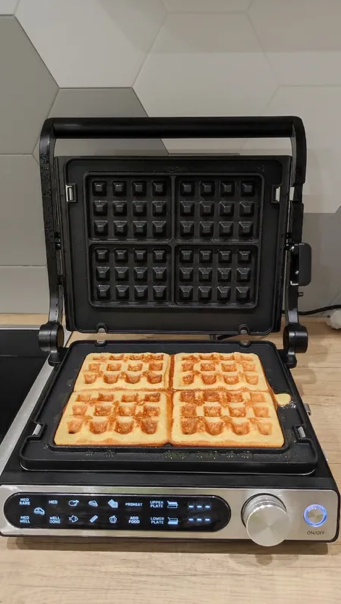 Теперь пару слов о панелях. Базовые панели двусторонние: с одной стороны плоские, с другой — рифленые, есть еще отдельные панели для вафель. Если установить обычные панели плоской или рифленой стороной вверх, а сам гриль разложить на 180 градусов, у вас получится большая площадка для барбекю. Так что вариантов готовки получается довольно много. Учитывая, что для каждой панели можно выбрать свою температуру, это позволяет жарить и овощи, и мясо одновременно.Причем ТЭНы встроены не в панели, а в корпус, так что панели легкие и без проблем моются в посудомоечной машине. Проблем с покрытием тоже пока не было замечено, если судить по отзывам на маркетплейсах.