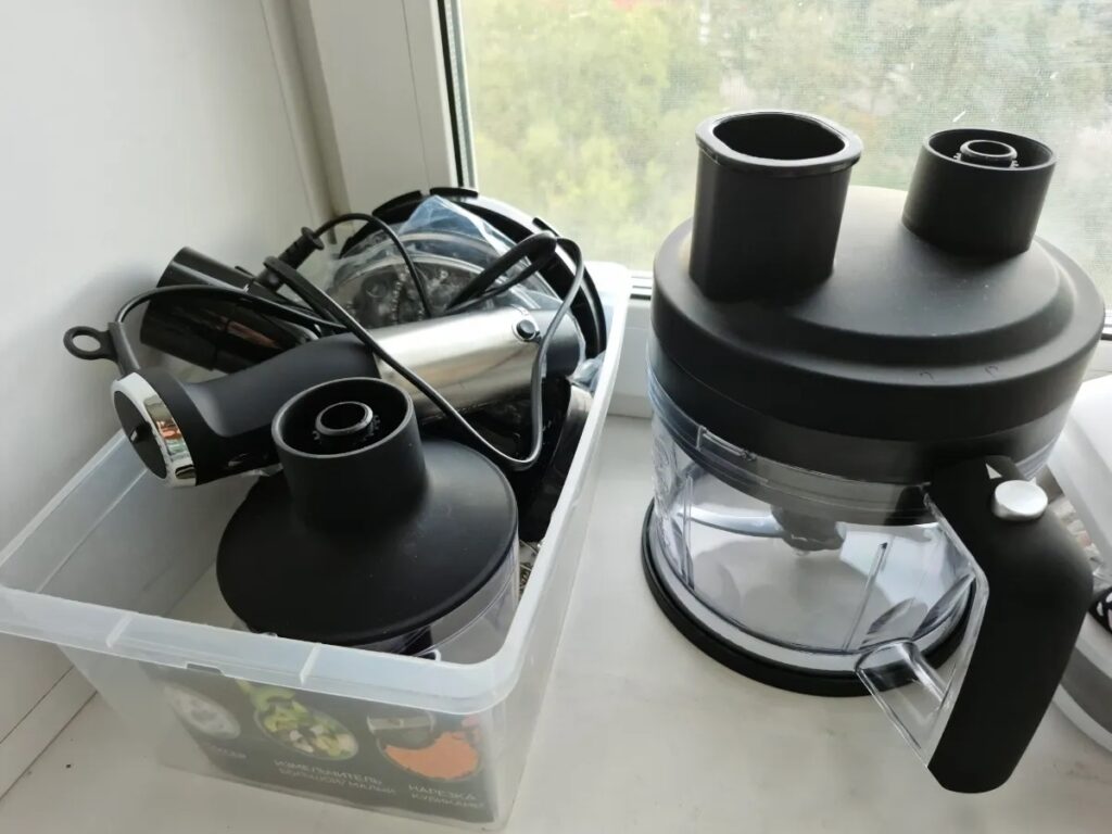 Комплектация. Хороший набор для кулинарных экспериментов с салатами, соусами, напитками и десертами. Комбайн, венчик, капучинатор, терка, шинковка, насадки для пюре и для нарезки кубиками — все они легко переставляются и моются. Но хранение не продумано — комплектующих много, а складывать их некуда.