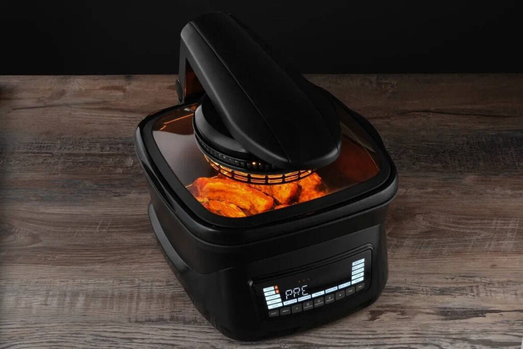 Последним мы протестировали Грандшеф Retaste. Это устройство выглядит ровно так, как вы себе представляете типичный аэрогриль: чаша с дисплеем, которую сверху накрывает прозрачная крышка с вентилятором и нагревательным элементом. Конструкцию нельзя назвать элегантной, но первый взгляд редко бывает верным — будем тестировать!