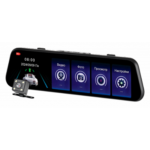 Диагональ. Видеорегистратор-зеркало с большим IPS экраном 9,66 дюйма. Есть возможность вывода на него картинки с любой из двух камер поочередно.