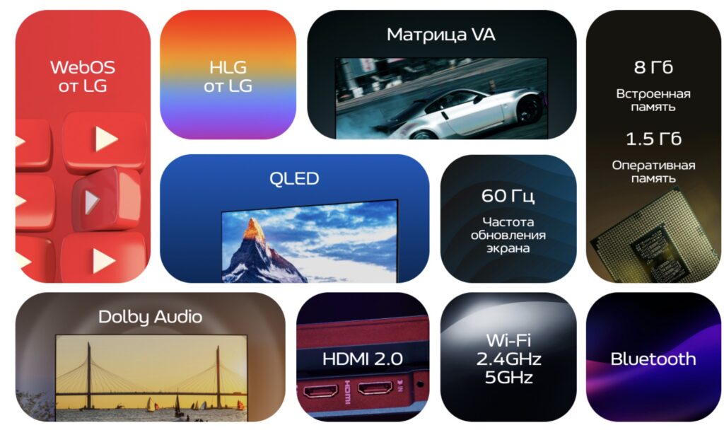 Со SMART TV на WebOS от LG доступны онлайн-кинотеатры, VK Видео, RuTube, YouTube и другие приложения, а чтобы найти сериал, передачу или музыку, не надо даже вставать с места — поможет пульт с голосовым управлением.