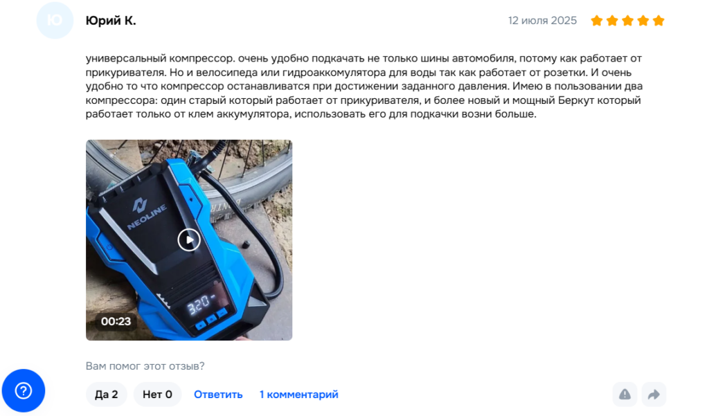 Отзывы. Пользователи отмечают компактность, удобство хранения и простоту использования компрессора.