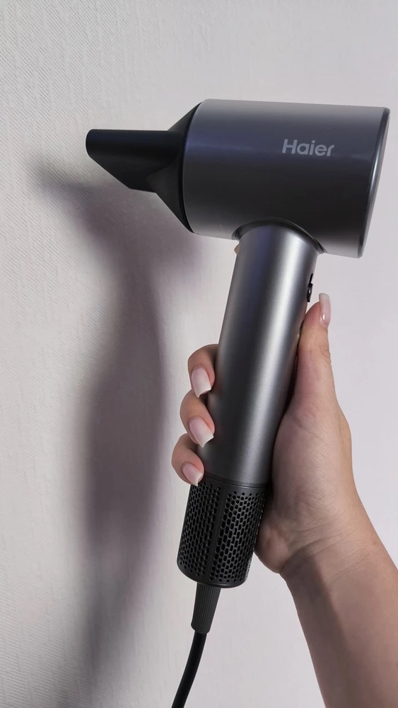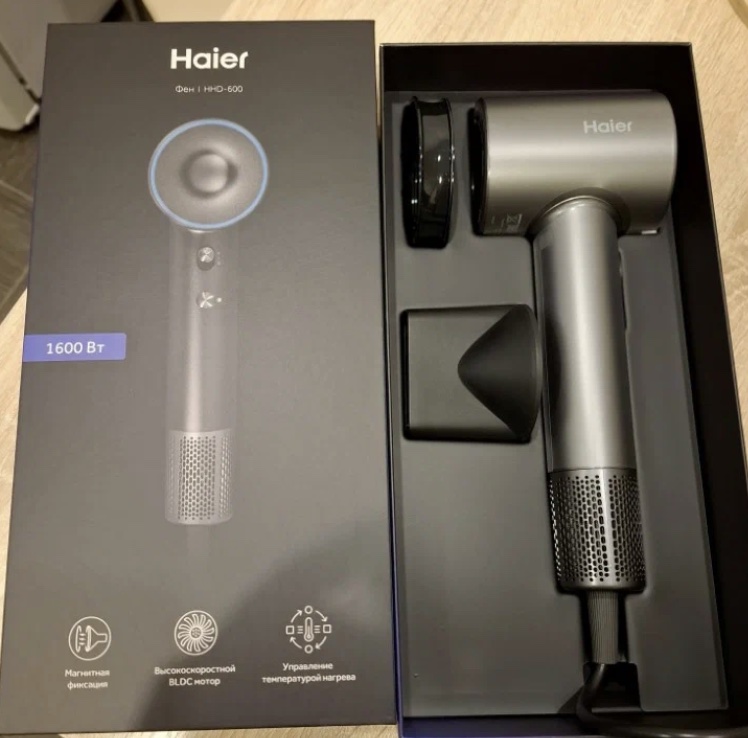 Первым я оценила Haier HHD-600. Стильный компактный фен графитового цвета в лаконичной упаковке оформлен просто и со вкусом.