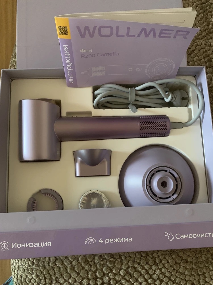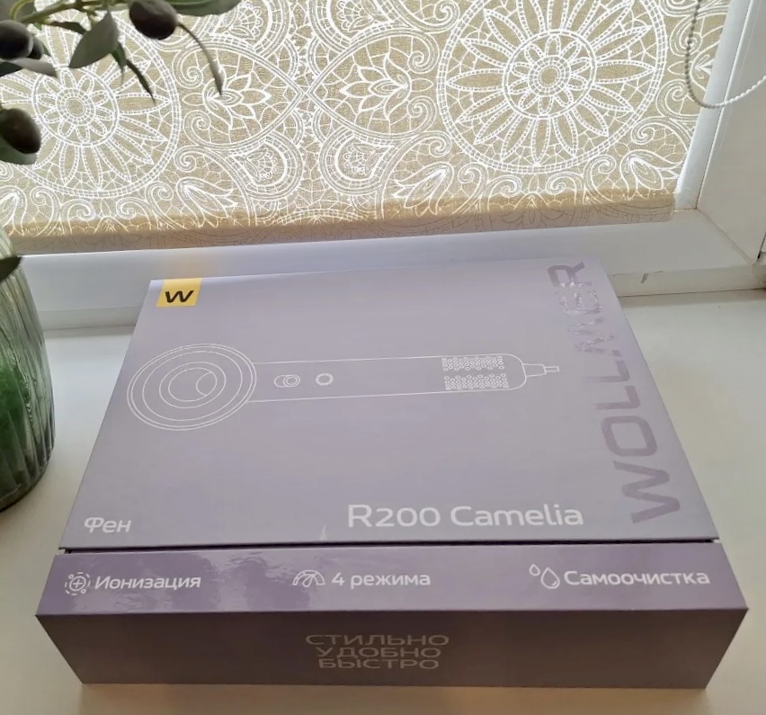 Второй в очереди на тестирование — фен Wollmer R200 Camelia. От вида шикарной упаковки мой внутренний эстет пришел в полный восторг.
